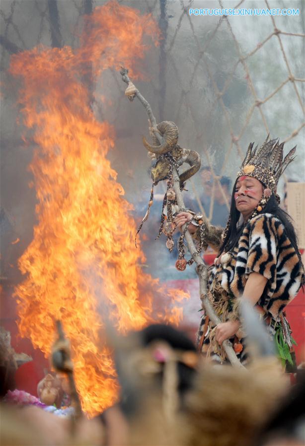Atores realizam uma performance em uma cerimônia de adoração a Fuxi e Nuwa, ancestrais humanos da mitologia chinesa, em Zoucheng, província de Shandong, no leste da China, em 30 de março de 2017. Mais de 500 pessoas se reuniram em Zoucheng para adorar Fuxi e Nuwa. (Xinhua/Zhu Zheng)