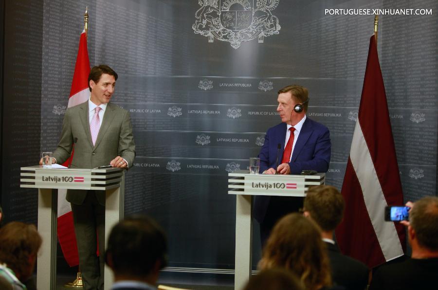 O primeiro-ministro canadense, Justin Trudeau, e o primeiro-ministro da Letônia, Maris Kucinskis, participam de uma conferência de imprensa em Riga, na Letônia, em 10 de julho de 2018. Trudeau prometeu compromisso com a segurança da Letônia durante sua visita a Riga na terça-feira, dizendo que o Canadá estenderia sua liderança do batalhão da OTAN estacionado no país báltico por mais quatro anos. (Xinhua/Janis)