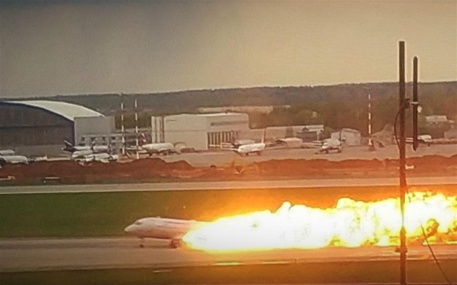 Um avião de passageiros é visto em chamas durante sua aterrissagem de emergência no Aeroporto Internacional de Sheremetyevo, em Moscou, Rússia, em 5 de maio de 2019. O Comitê de Investigação da Rússia confirmou 37 sobreviventes dos 78 passageiros a bordo de um avião SSJ-100 a caminho da cidade russa de Murmansk, que estava em chamas durante um pouso de emergência no Aeroporto Internacional de Sheremetyevo, em Moscou, no domingo. (Xinhua/Sergei)