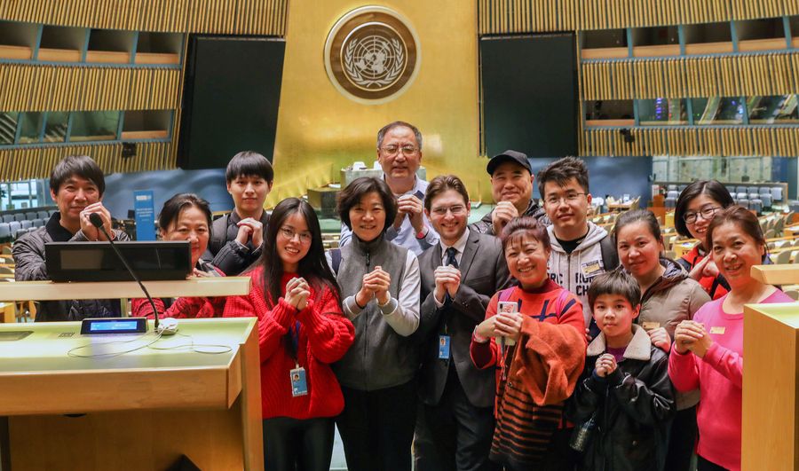 Um grupo de turistas chineses posa para foto no salão da Assembleia Geral na sede das Nações Unidas em Nova York, em 5 de fevereiro de 2019. (Xinhua/Ma Jianguo)