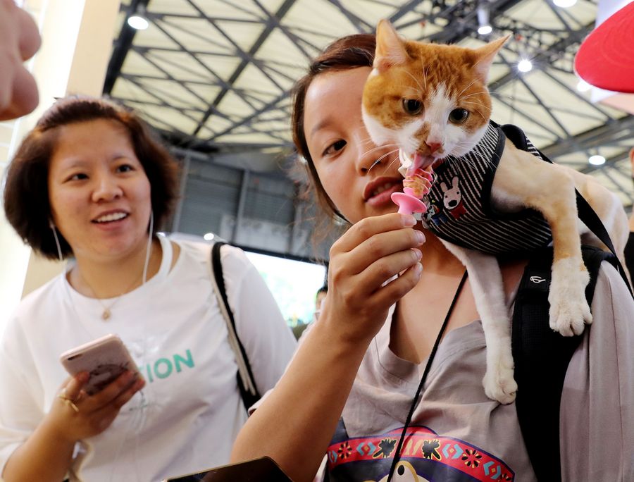 Um gato experimenta aperitivo na 21ª Pet Fair Asia em Shanghai, no leste da China, em 25 de agosto de 2018. (Xinhua/Fang Zhe)