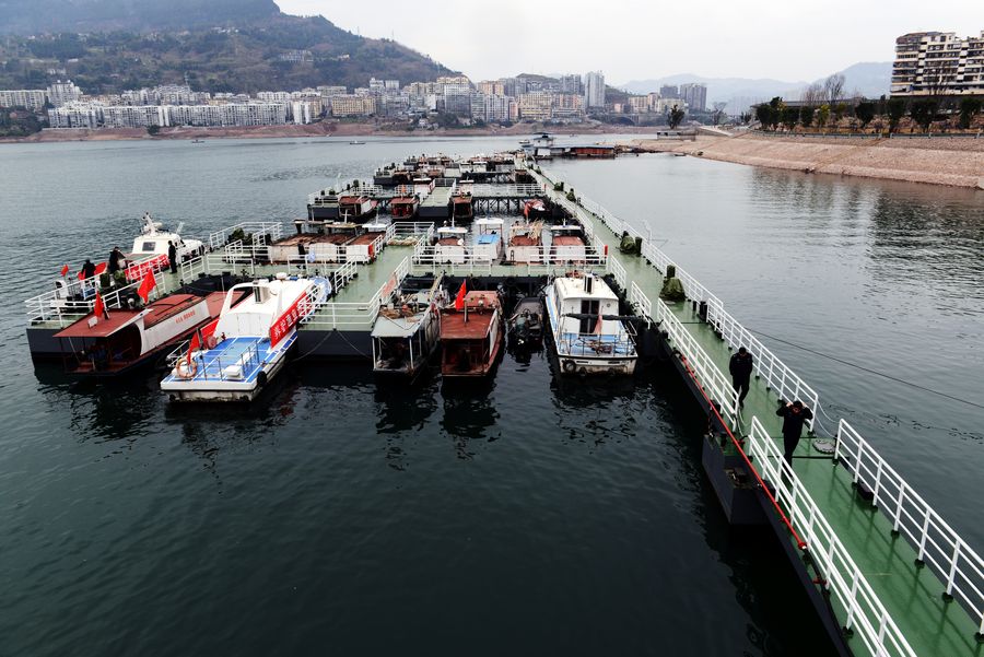Barcos de pesca no rio Pengxi, um afluente do rio Yangtzé, no distrito de Yunyang, Município de Chongqing, no sudoeste da China, em 1º de março de 2019. (Xinhua/Xie Hong)