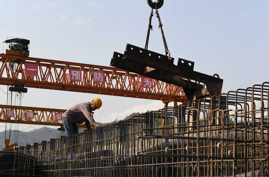 Um trabalhador está construindo vigas de ponte para a rodovia Mojiang-Lincang, no distrito autônomo das Etnias Yi, Hani e Lahu de Zhenyuan, Província de Yunnan, no sudoeste da China, em 13 de abril de 2020. (Xinhua/Yang Zongyou)