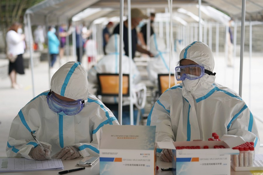 Trabalhadores médicos trabalham em um local de teste de ácido nucleico na rua Shoupakou do Sul, no distrito de Xicheng, Beijing, capital da China, em 24 de junho de 2020. (Xinhua/Xing Guangli)