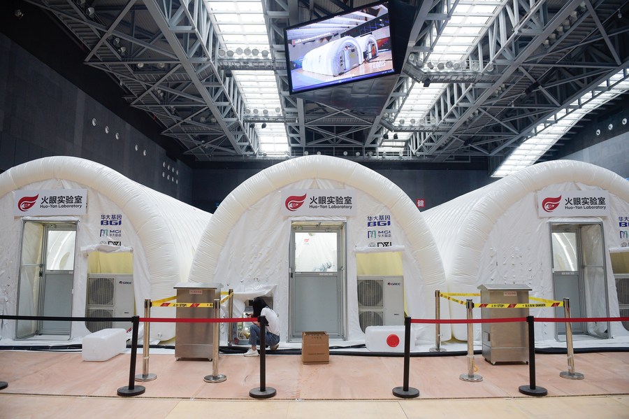 Foto tirada em 22 de junho de 2020 mostra um laboratório de testes da COVID-19 construído com uma estrutura inflada a ar no distrito de Daxing, em Beijing, capital da China. (Xinhua/Peng Ziyang)