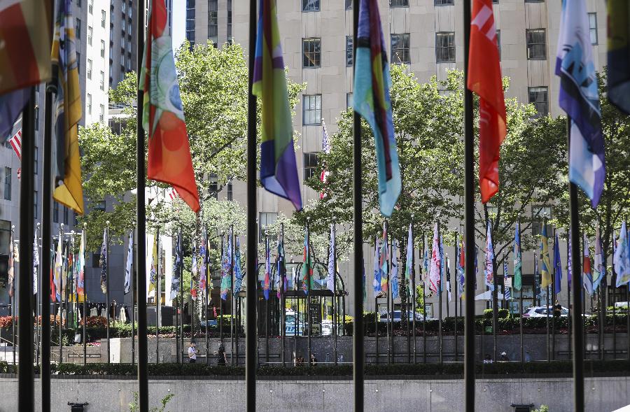 Nova York, 1 ago (Xinhua) - Uma nova instalação de arte pública "O Projeto Bandeira", com 192 bandeiras recém-projetadas que mostram amor pela cidade de Nova York, é exibida em uma exposição temporária no Centro Rockefeller, de 1º a 16 de agosto.