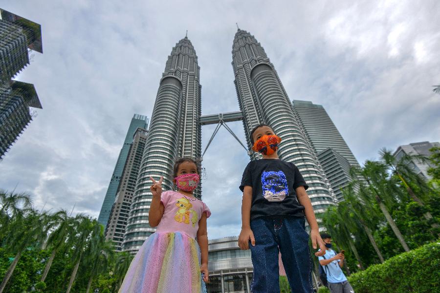Crianças usando máscaras posam para fotos na frente das Torres Gêmeas Petronas em Kuala Lumpur, Malásia, no dia 3 de outubro de 2020. A Malásia relatou um aumento diário de 317 novas infecções confirmadas de COVID-19 no sábado, elevando sua contagem total para 12.088. (Foto por Chong Voon Chung/Xinhua)
