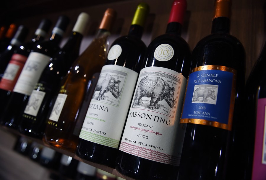 Garrafas de vinho da Itália são exibidas na área de exibição de Alimentos e Produtos Agrícolas durante a terceira Exposição Internacional de Importação da China (CIIE) em Shanghai, leste da China, 7 de novembro de 2020. (Xinhua/Zhao Dingzhe)