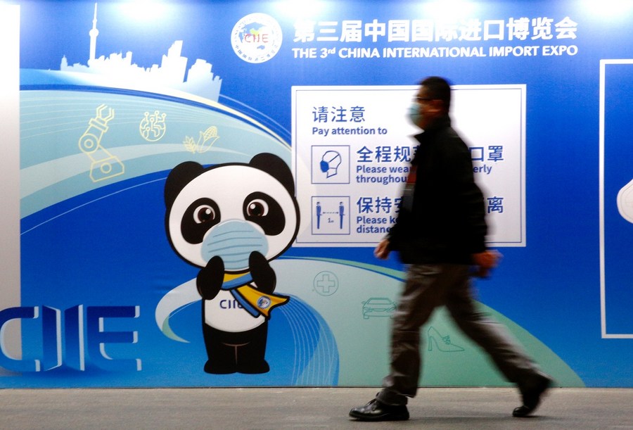 Um membro da equipe passa por um quadro de aviso sobre medidas de prevenção e controle de epidemia durante a 3ª Exposição Internacional de Importação da China (CIIE) em Shanghai, leste da China, em 4 de novembro de 2020. (Xinhua/Zhang Yuwei)