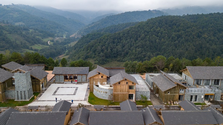 Foto aérea tirada em 13 de outubro de 2020 mostra uma vista da aldeia de Sanhe no distrito de Zhaojue, sub-região autônoma da etnia Yi de Liangshan, na Província de Sichuan, no sudoeste da China. (Xinhua/Zhang Xiaoyu)