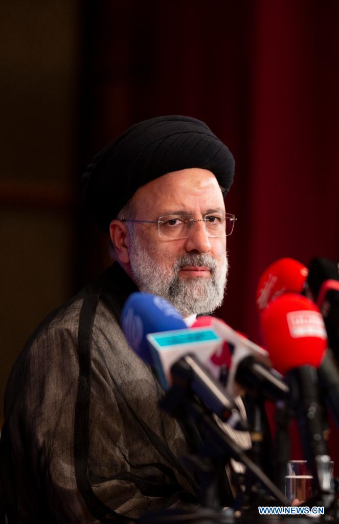 O presidente eleito do Irã, Ebrahim Raisi, participa de sua primeira entrevista coletiva após vencer a eleição em Teerã, Irã, no dia 21 de junho de 2021. Raisi disse na segunda-feira que os Estados Unidos devem suspender "todas as sanções injustas" ao Irã e a Europa deve cumprir seus compromissos sob o acordo nuclear de 2015. (Foto por Ahmad Halabisaz/Xinhua)