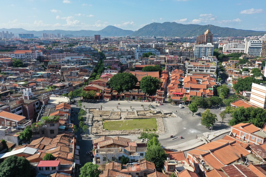 Foto aérea tirada em 7 de julho de 2021 mostra as ruínas do Portão Deji e a paisagem ao redor da cidade de Quanzhou, Província de Fujian, leste da China. (Xinhua/Jiang Kehong)