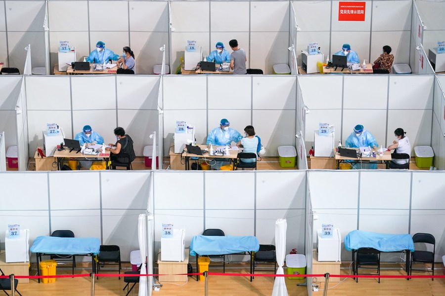 Moradores são vacinados contra a COVID-19 em um local de vacinação em um estádio em Nanjing, capital da Província de Jiangsu, leste da China, em 2 de agosto de 2021. (Xinhua/Li Bo)