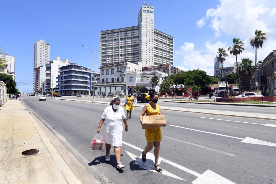 Pessoas com máscaras caminham em uma rua em Havana, Cuba, em 9 de agosto de 2021. (Xinhua/ Joaquin Hernandez)