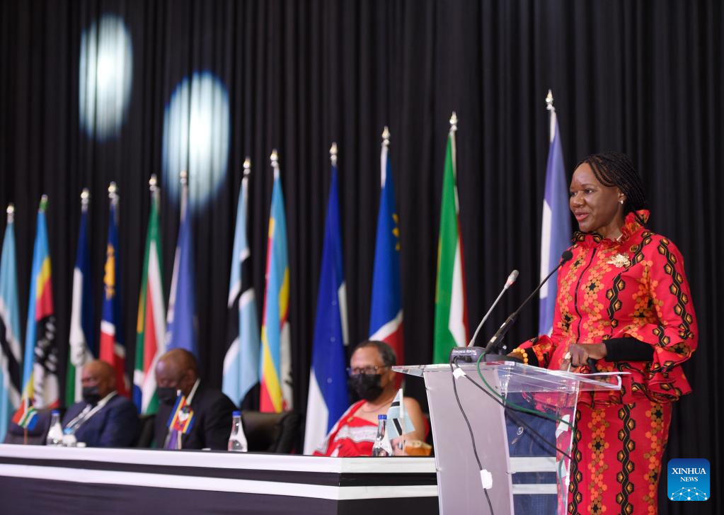 Paulina Elago (direita), secretária-executiva da União Aduaneira da África Austral (SACU), fala na 7ª Cúpula dos Chefes de Estado e de Governo da SACU em Gaborone, Botsuana, no dia 30 de junho de 2022. (Foto por Tshekiso Tebalo/Xinhua)