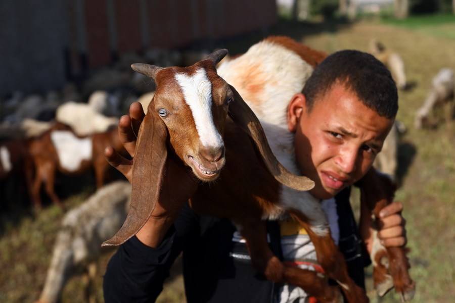 Agricultor carrega uma cabra durante o pastoreio de gado nos arredores de Gizé, Egito, no dia 26 de junho de 2022. Agricultores locais estão engordando seu gado em preparação para o próximo Eid al-Adha. (Xinhua/Ahmed Gomaa)