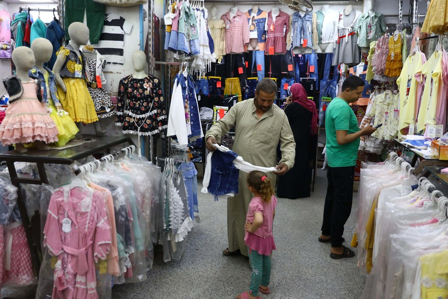 Pessoas compram roupas em uma loja para o próximo Eid al-Adha no Cairo, Egito, no dia 6 de julho de 2022. (Xinhua/Ahmed Gomaa)