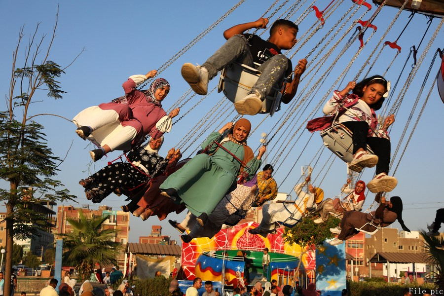 Pessoas se divertem em um parque durante o feriado de Eid al-Adha na província de Qalyubia, Egito, no dia 23 de julho de 2021. (Xinhua/Ahmed Gomaa)