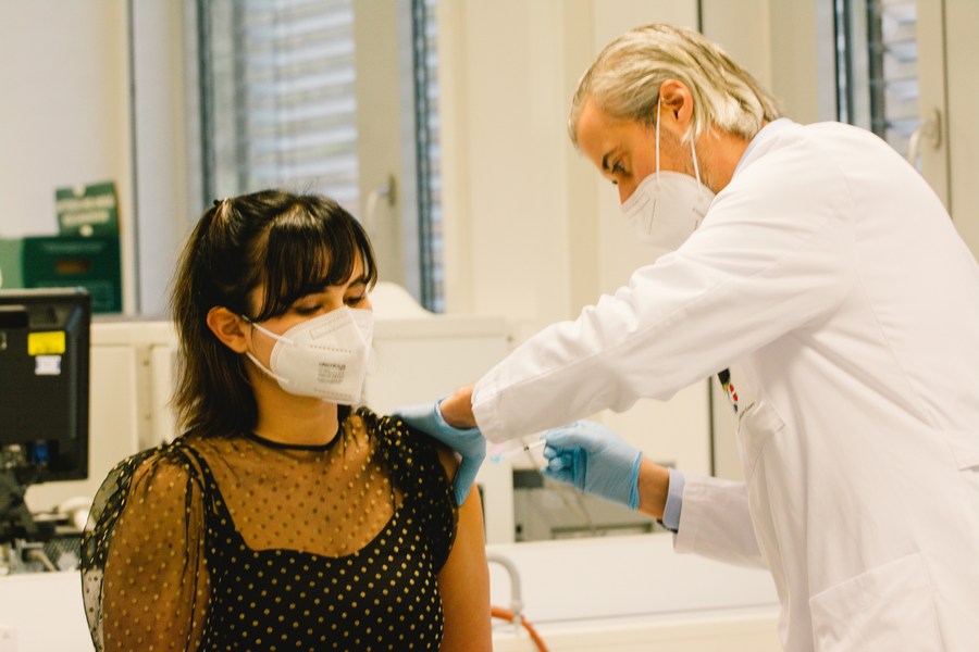 Profissional médico (esquerda) recebe uma vacina contra COVID-19 no hospital universitário de Essen em Essen, Alemanha, no dia 18 de janeiro de 2021. (Foto por Tang Ying/Xinhua)