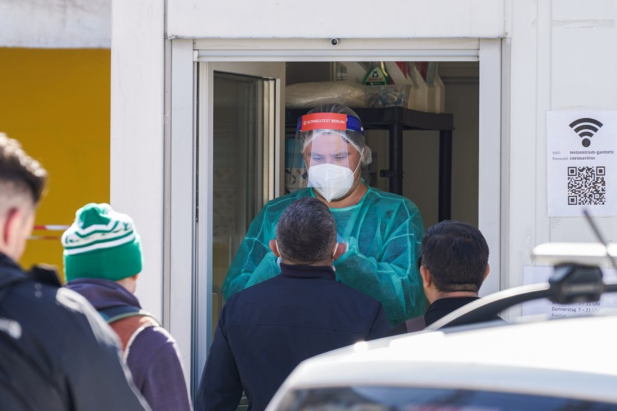 Profissional de saúde coleta amostra de cotonete de um homem em uma estação de teste de COVID-19 em Berlim, capital da Alemanha, no dia 24 de março de 2022. (Foto por Stefan Zeitz/Xinhua)