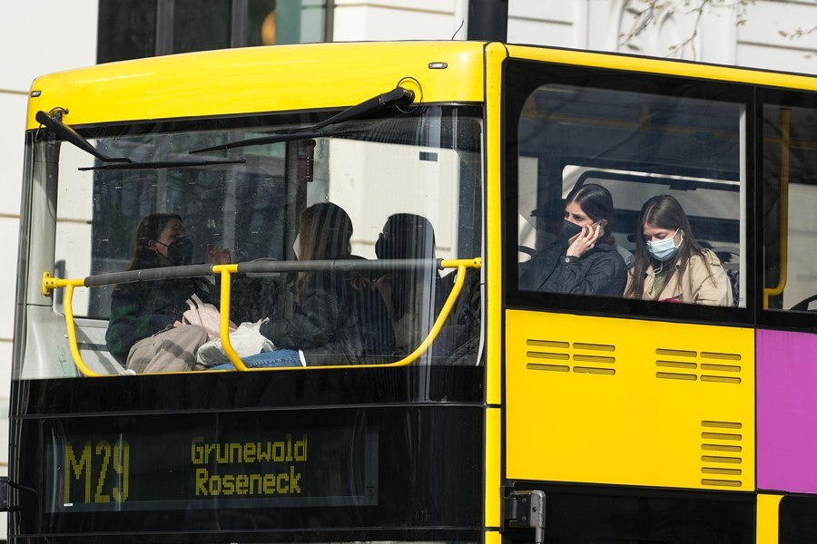 Passageiros usando máscaras são vistos em um ônibus em Berlim, capital da Alemanha, no dia 1º de abril de 2022. (Foto por Stefan Zeitz/Xinhua)