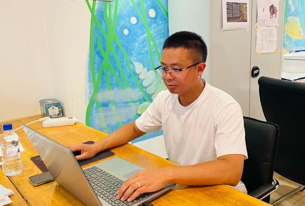 Wu Yuxiang, membro da equipe do departamento de materiais do Projeto da Ponte Peljesac, trabalha no escritório em Komarna, Croácia, no dia 23 de julho de 2022. (China Road and Bridge Corporation/Divulgação via Xinhua)