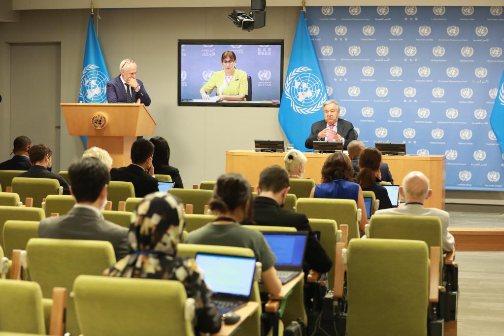 O secretário-geral da ONU, António Guterres, fala no lançamento do terceiro relatório de seu Grupo Global de Resposta a Crises sobre Alimentos, Energia e Finanças sobre o conflito na Ucrânia na sede da ONU em Nova York, no dia 3 de agosto de 2022. Guterres pediu na quarta-feira a tributação dos lucros inesperados das empresas de petróleo e gás para aliviar o impacto da crise energética sobre as pessoas mais vulneráveis. (Xinhua/Xie E)