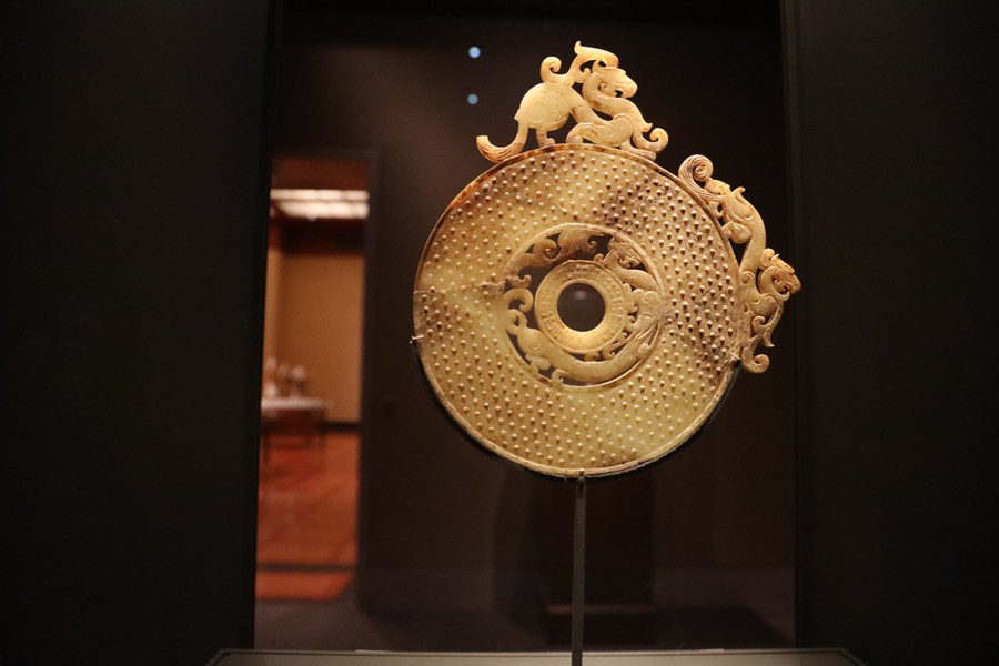 Foto tirada no dia 11 de agosto de 2022 mostra um disco de jade ritual com motivos de dragão do século III a.C., exibido no Museu de Arte Nelson-Atkins em Kansas City, Missouri, Estados Unidos. (Xinhua/Xu Jianmei)