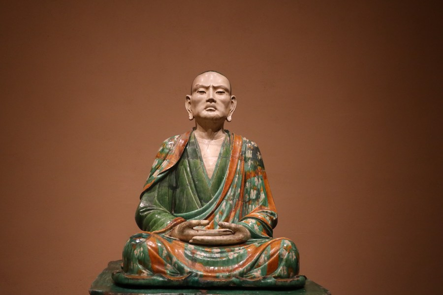 Uma escultura Luohan com esmalte de chumbo de três cores da Dinastia Liao à Dinastia Jin é encontrada nas cavernas nas altas falésias de Yixian, província de Hebei, na China. A expressão solene e a dignidade retratam sua concentração e presença espiritual.