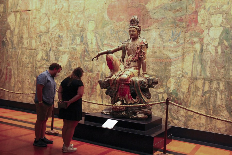 Visitantes em frente à antiga escultura chinesa "Guanyin do Mar da China Meridional" no Museu de Arte Nelson-Atkins em Kansas City, Missouri, Estados Unidos, no dia 11 de agosto de 2022. (Xinhua/Xu Jing)