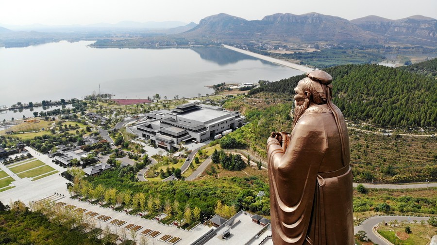 Foto aérea tirada em 27 de setembro de 2022 mostra o local do Festival Cultural Internacional de Confúcio da China de 2022 e Oitavo Fórum Nishan sobre Civilizações Mundiais em Qufu, terra natal de Confúcio, na Província de Shandong, leste da China. (Xinhua/Li Ziheng)