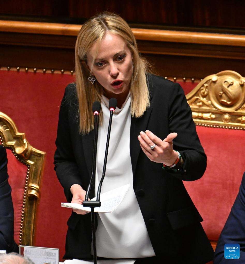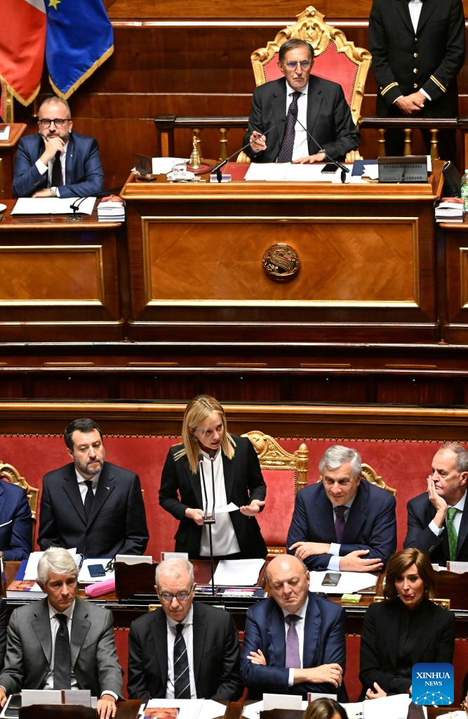 Roma, 26 out (Xinhua) -- O novo gabinete italiano liderado pela primeira-ministra Giorgia Meloni ganhou um voto de confiança na quarta-feira na câmara alta do parlamento italiano cm uma margem com folga.