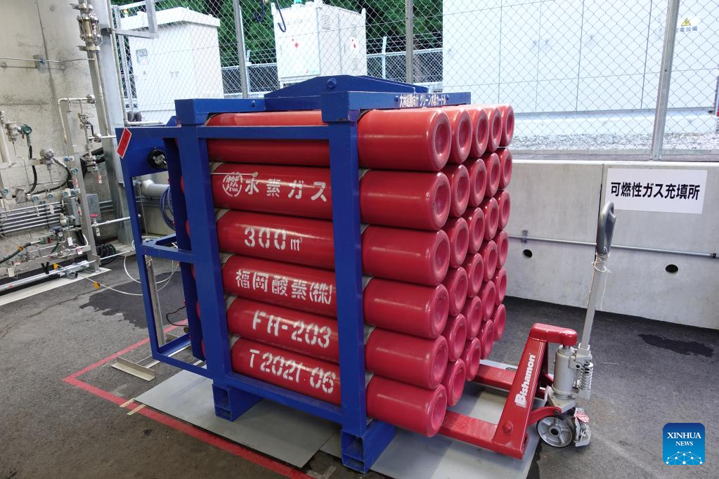 Foto tirada em 9 de dezembro de 2022 mostra um feixe de cilindros de hidrogênio em uma planta de teste para produzir hidrogênio usando energia geotérmica em Kokonoemachi, Prefeitura de Oita, Japão. A prefeitura japonesa de Oita, famosa por fontes termais, está avançando a todo vapor no desenvolvimento de energia geotérmica, já que o país pretende se tornar neutro em carbono até 2050. (Xinhua/Zhang Yiyi)