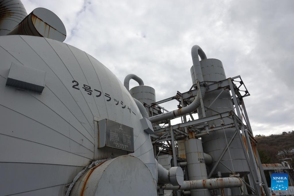 Foto tirada em 9 de dezembro de 2022 mostra uma instalação de águas termais na cidade de Taketa, Prefeitura de Oita, Japão. A prefeitura japonesa de Oita, famosa por fontes termais, está avançando a todo vapor no desenvolvimento de energia geotérmica, já que o país pretende se tornar neutro em carbono até 2050. (Xinhua/Zhang Yiyi)