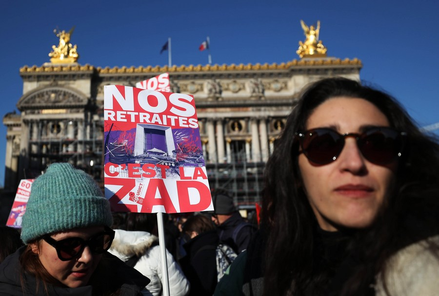 Manifestantes participam de um protesto contra a reforma previdenciária proposta pelo governo em Paris, França, no dia 7 de fevereiro de 2023. (Xinhua/Gao Jing)