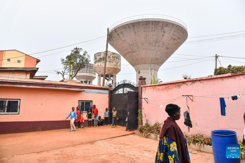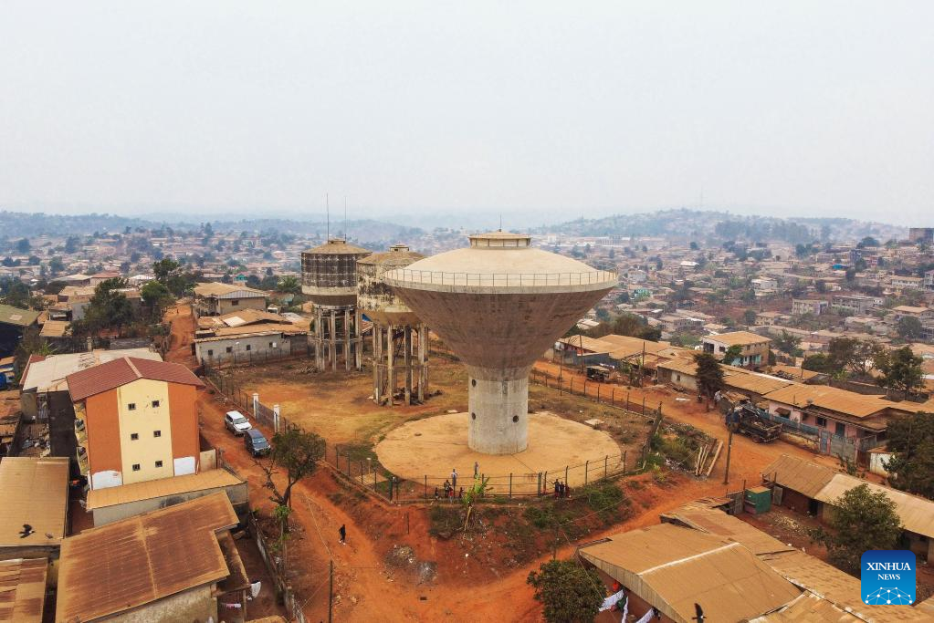 Foto aérea tirada em 2 de março de 2023 mostra uma vista da torre de água construída pelo Grupo CGCOC em Bafoussam, Camarões. (Xinhua/Kepseu)