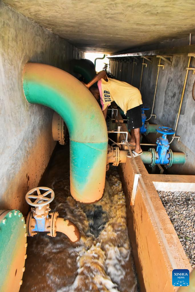 Um funcionário verifica os canos de drenagem de água na estação de tratamento de água em Bafoussam, Camarões, em 2 de março de 2023. (Xinhua/Kepseu)