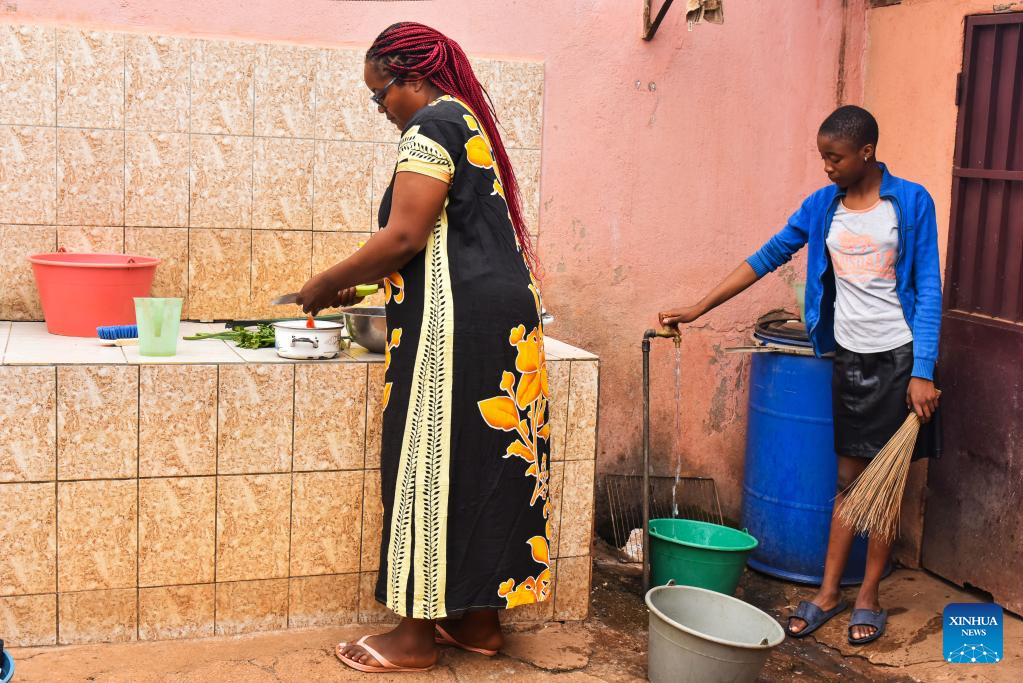 A maior caixa d'água foi construída a poucos metros da casa de Wandji. Quando a Xinhua a visitou, ela estava ocupada buscando água para preparar o jantar.