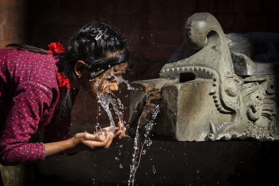 Menina lava o rosto com água em bica de pedra em Lalitpur, Nepal, no dia 22 de março de 2023, o Dia Mundial da Água. (Foto por Hari Maharjan/Xinhua)