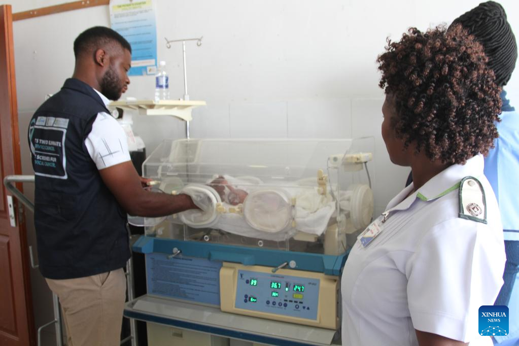 Delight Madoro (e), médico assessor do Distrito de Marondera, verifica um bebê recém-nascido em uma incubadora no Hospital de Mahusekwa em Mahusekwa, Província de Mashonaland Oriental, Zimbábue, em 24 de março de 2023. (Xinhua/Zhang Baoping)