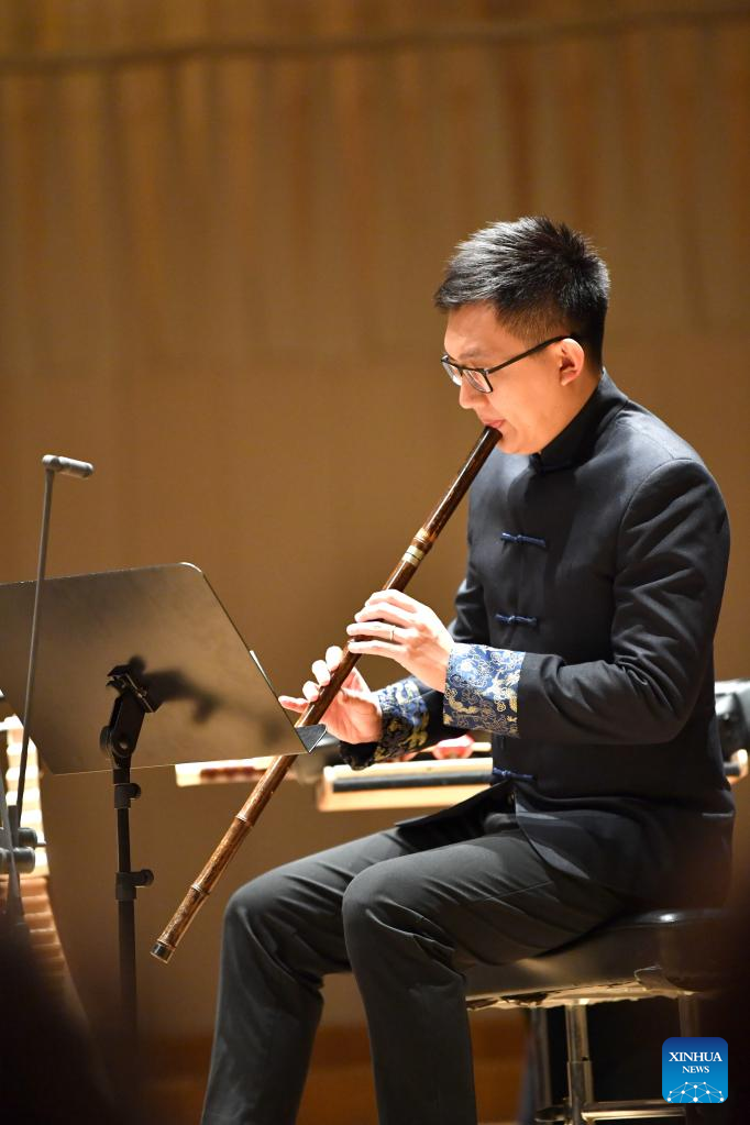 Tan Qinglun toca instrumento musical tradicional chinês Xiao, uma flauta vertical de bambu, em St. Gallen, Suíça, no dia 28 de abril de 2023. (Xinhua/Lian Yi)