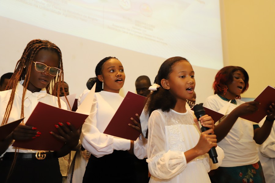 Estudantes angolanos cantam durante o Concurso Mundial de Proficiência em Língua Chinesa "Chinese Bridge" em Luanda, Angola, em 21 de junho de 2023. (Xinhua/Lyu Chengcheng)