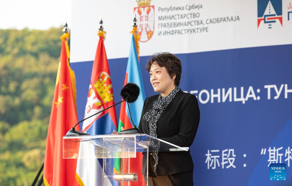 A embaixadora chinesa na Sérvia, Chen Bo, fala na cerimônia de inauguração do trecho final do anel viário de Belgrado, do túnel Strazevica ao complexo viário Bubanj Potok em Belgrado, Sérvia, no dia 28 de junho de 2023. Um novo trecho do anel viário foi liberado nesta quarta-feira para o tráfego de veículos em Belgrado, capital da Sérvia, o que ajudará a facilitar o trânsito nas principais rodovias de Belgrado. A rodovia com 9,74 quilômetros de extensão foi construída pela Power Construction Corporation of China (PowerChina). (Foto por Wang Wei/Xinhua)