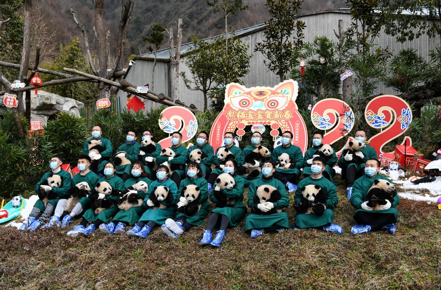 Membros da equipe seguram filhotes de panda gigante em evento de apresentação em grupo na base de Shenshuping do Centro de Conservação e Pesquisa de Pandas Gigantes da China em Wolong, província de Sichuan, sudoeste da China, no dia 24 de janeiro de 2022. (Xinhua/Wang Xi)