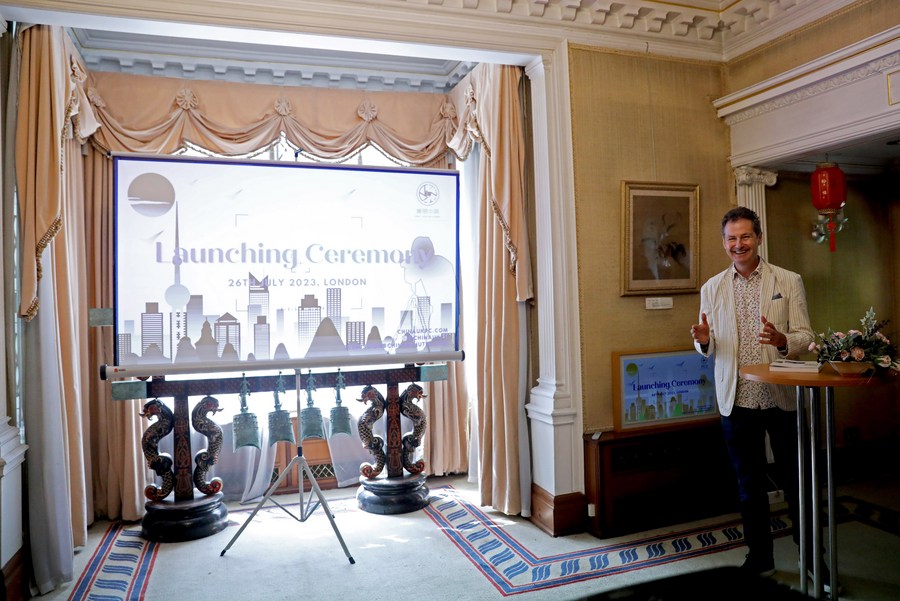 Tim Flach, presidente da Associação de Fotógrafos da Grã-Bretanha, discursa em cerimônia de lançamento chamada "Beauty Across Borders: China-Britain Photography Competition" (Beleza além das Fronteiras: Competição de Fotografia China-Grã-Bretanha, em tradução livre) em Londres, Grã-Bretanha, no dia 26 de julho de 2023. (Xinhua/Li Ying)
