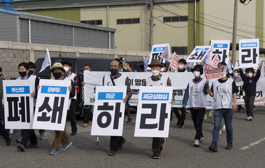 Grupos cívicos e residentes locais protestam nas ruas contra laboratórios biológicos dos EUA perto de uma base militar dos EUA em Busan, Coreia do Sul, no dia 5 de abril de 2022. (Foto por James Lee/Xinhua)