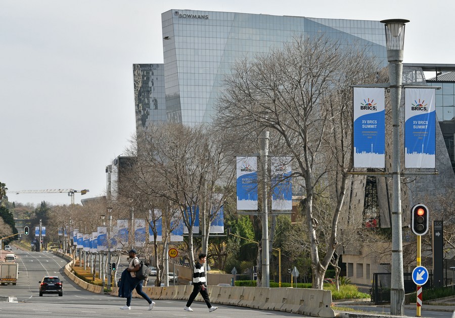 Faixas da 15ª edição da Cúpula do BRICS em rua de Joanesburgo, África do Sul, no dia 17 de agosto de 2023. (Xinhua/Chen Cheng)