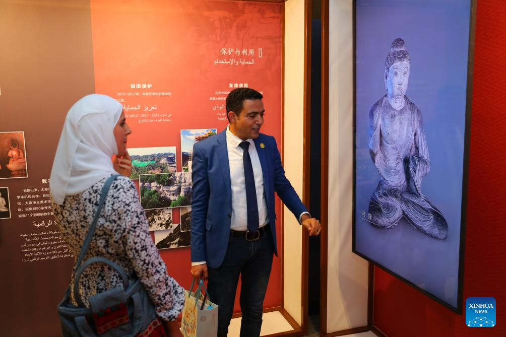 Uma exposição da restauração digital das Grutas de Tianlongshan de Taiyuan teve início no sábado no Centro Cultural da China no Cairo, atraindo mais de 70 especialistas e acadêmicos no campo da arqueologia e museus da China e do Egito no primeiro dia. (Xinhua/Sui Xiankai)