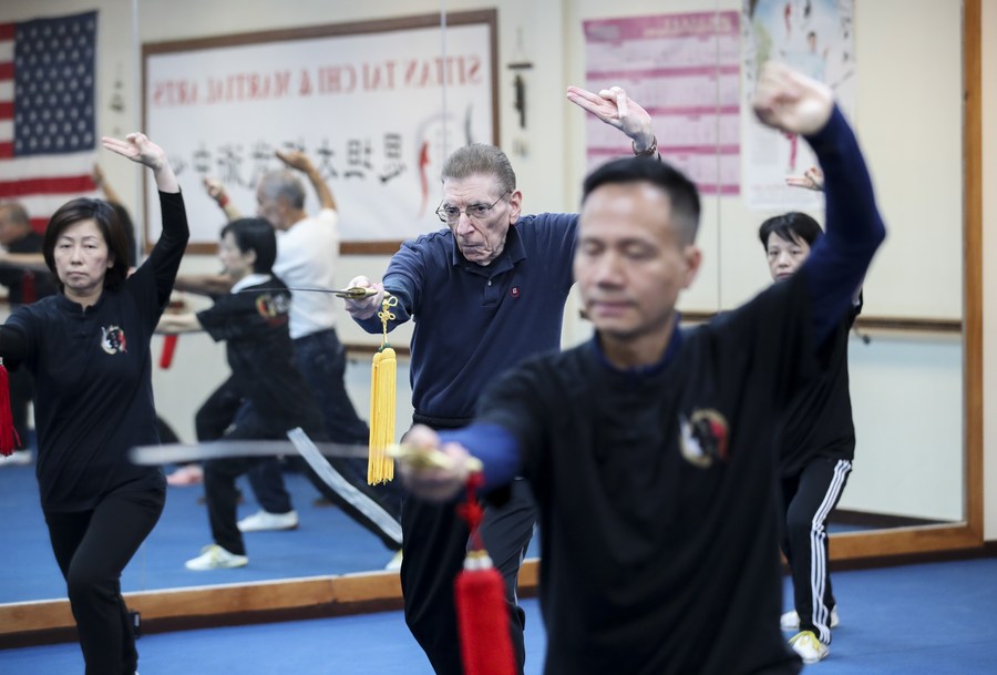Pessoas praticam a Espada Tai Chi na Sitan Tai Chi and Martial Arts, uma escola de arte marcial em Syosset, Nova York, Estados Unidos, em 20 de novembro de 2019. (Xinhua/Wang Ying)