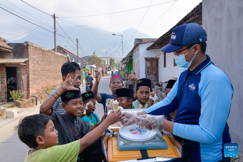 Crianças compram sorvete Aice na bicicleta de vendas de sorvete Aice de Yusuf Afat em Mojokerto, Java Oriental, Indonésia, no dia 14 de setembro de 2023. Vivendo nos trópicos, o povo indonésio sofre com o clima escaldante. Aice, famosa marca de sorvetes do país, refresca e traz alegria. (Xinhua/XuQin)